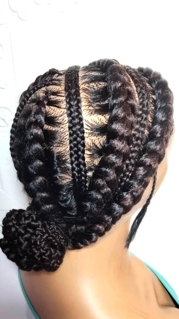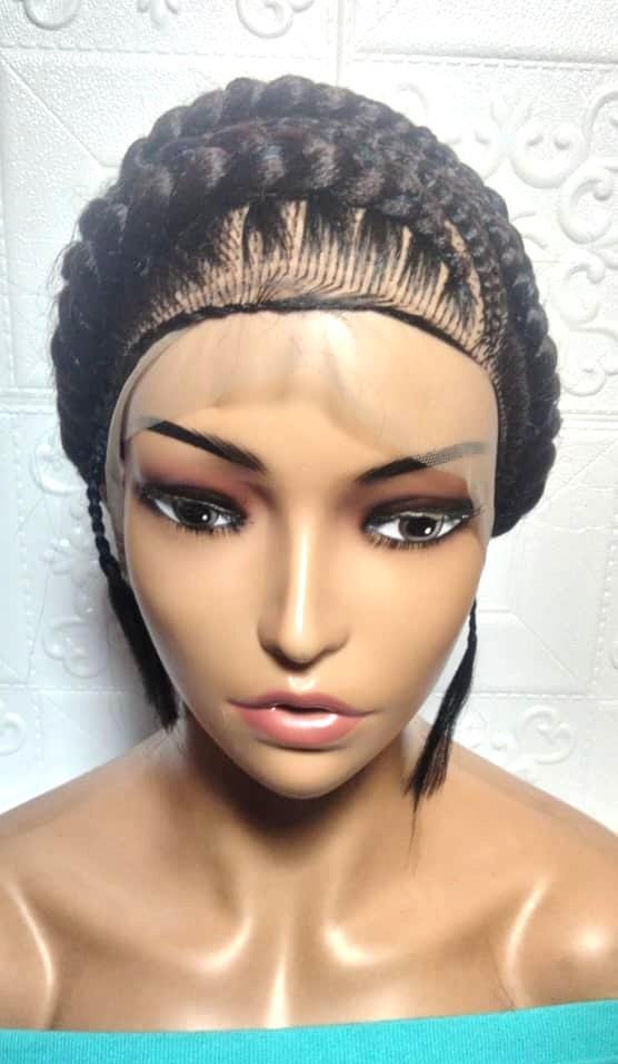 This beautiful handmade wig features Large Cornrow Stitch Braids, Bun Braided Wig.