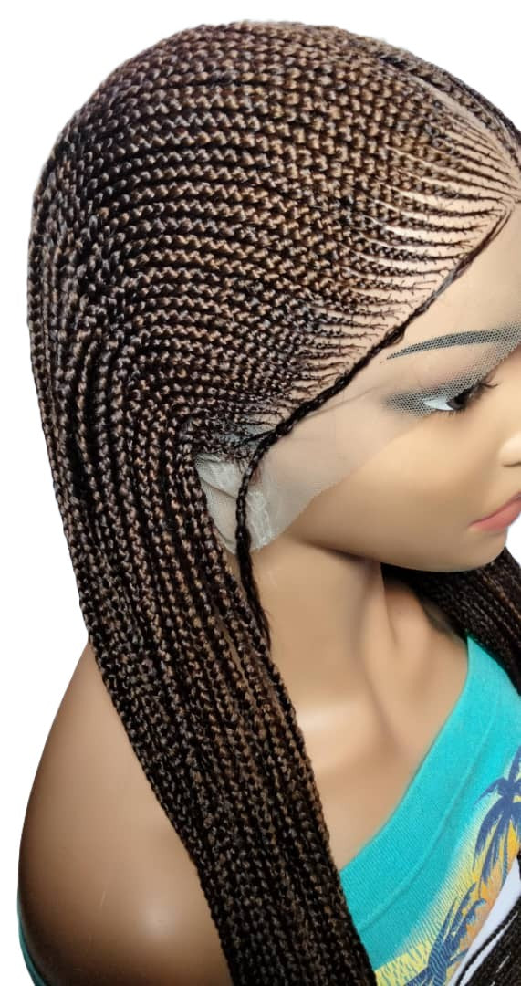 This beautiful handmade wig, made with synthetic hair extensions, features Cornrow Braids Braided Wig with individual Box Braids in the back.