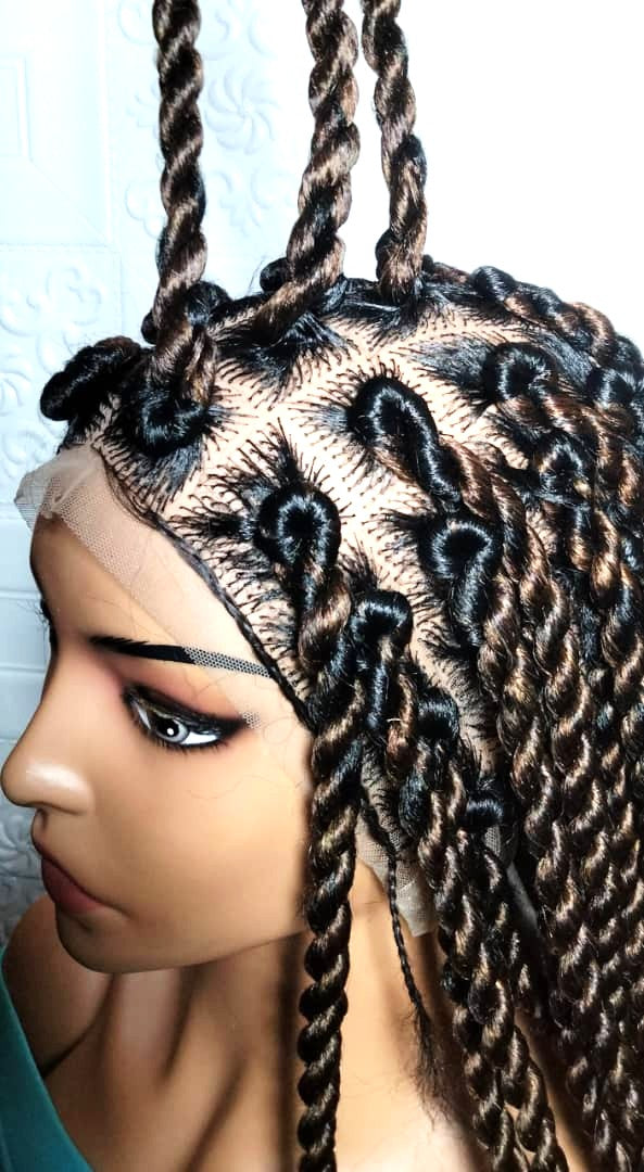 This beautiful handmade wig, made with synthetic hair extension, features intricate Large Knotless Box Twist Braids.