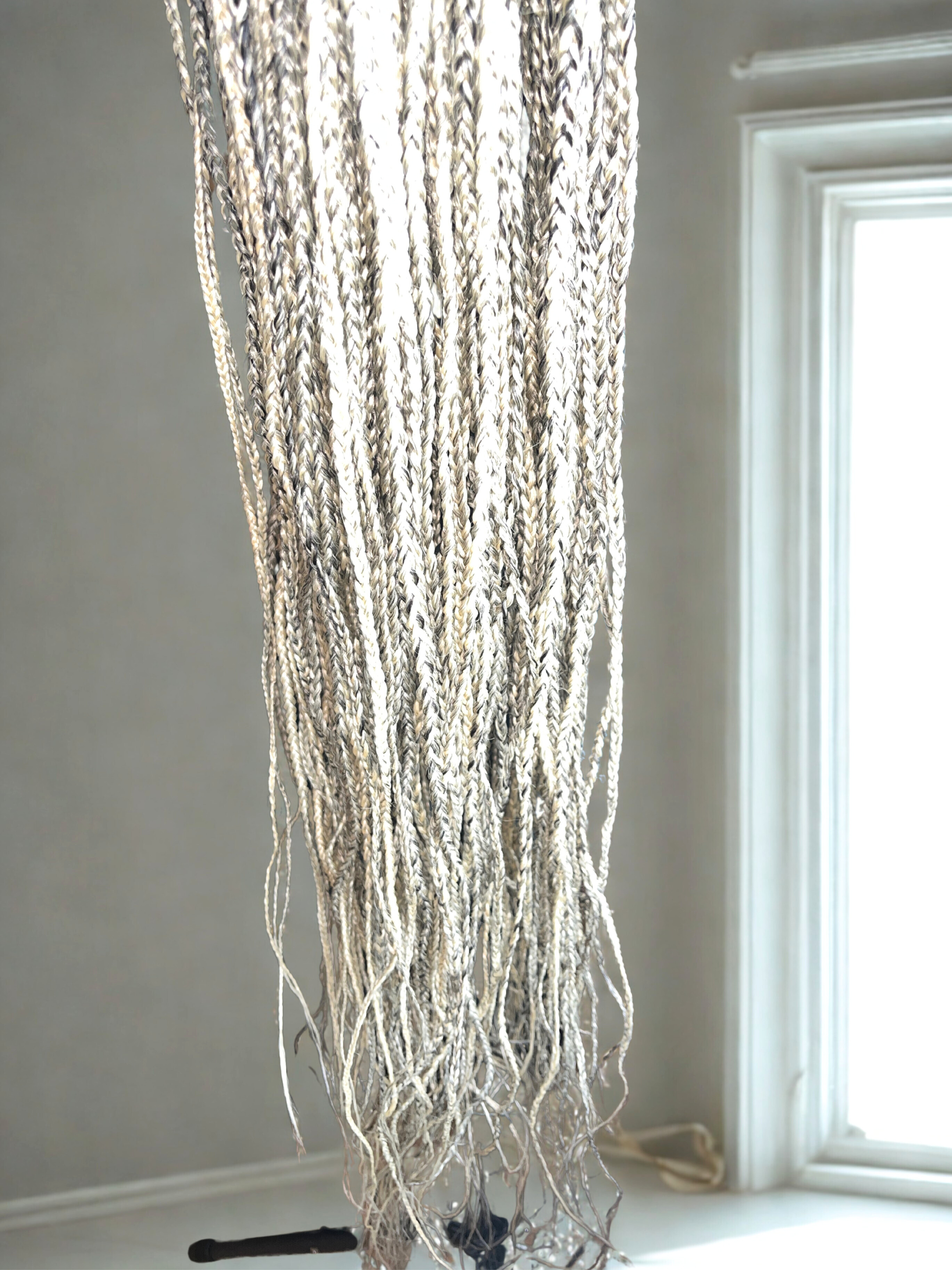 This beautiful handmade wig, made with synthetic hair extension, features intricate Knotless Box Braids